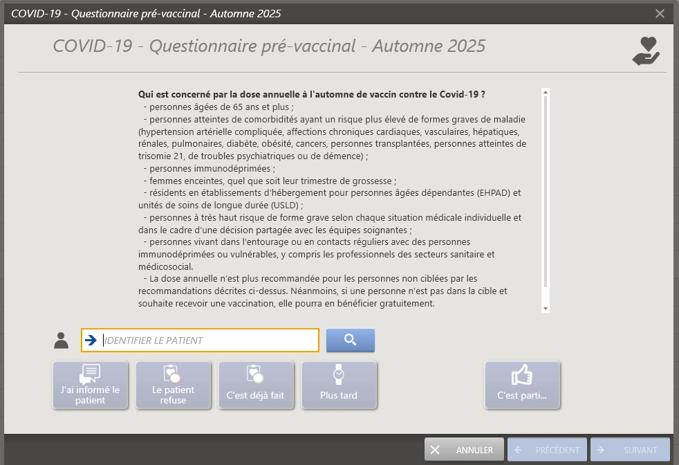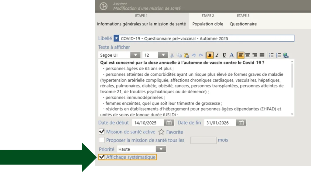 • Affichez la mission « COVID-19 – Questionnaire pré-vaccinal – Automne 2025 » de façon systématique pour les personnes de 65 ans et plus et venue 1 fois dans les 6 derniers mois.