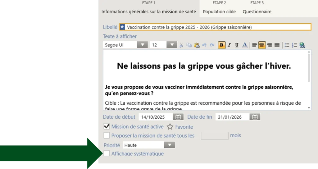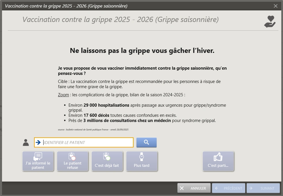 • Affichez la mission « Vaccination contre la grippe 2025 – 2026 » de façon systématique pour les personnes de 65 ans et plus et les femmes enceintes.