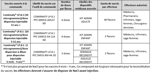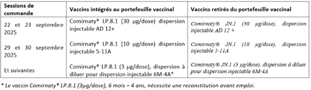 Pour cette campagne, des vaccins Comirnaty® adaptés au variant LP.8.1 seront utilisés. La première session de commande ouvrira le lundi 22 septembre matin et prendra fin le mardi 23 septembre à 23h. La session suivante sera proposée du lundi 29 au mardi 30 septembre. Nous vous invitons à passer commande auprès de vos officines de référence.