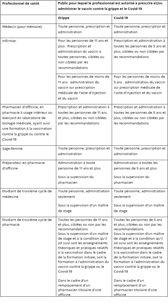 Les compétences des professionnels de santé en matière de vaccination contre la grippe saisonnière et le Covid-19 sont rappelées sur le site du ministère et dans l’annexe jointe.