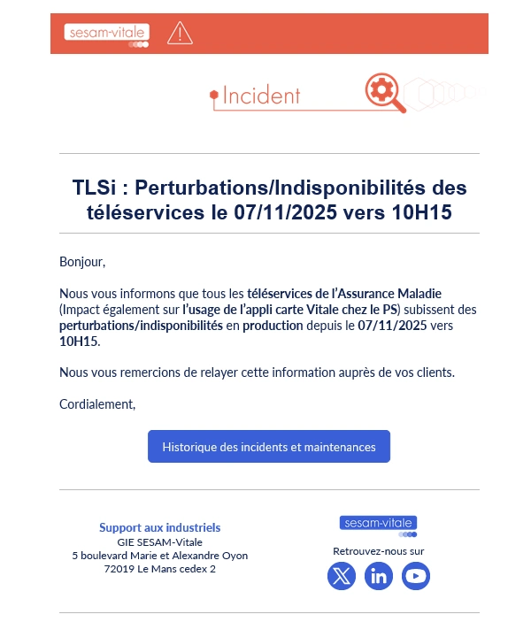 Nous vous informons que tous les téléservices de l’Assurance Maladie (Impact également sur l’usage de l’appli carte Vitale chez le PS) subissent des perturbations/indisponibilités en production depuis le 07/11/2025 vers 10H15.
